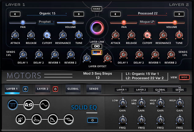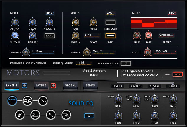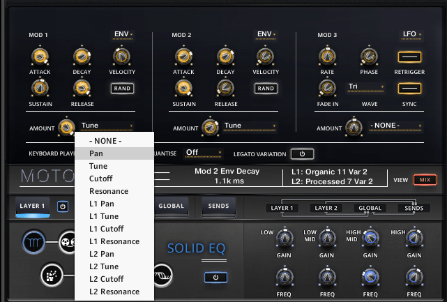 This opens a series of options, again for each sound layer. Here you can set up to three mods with LFO, envelope and sequence for each mod. You have the option to control a mod globally or for each layer, with a handy randomiser button for the envelope parameters.