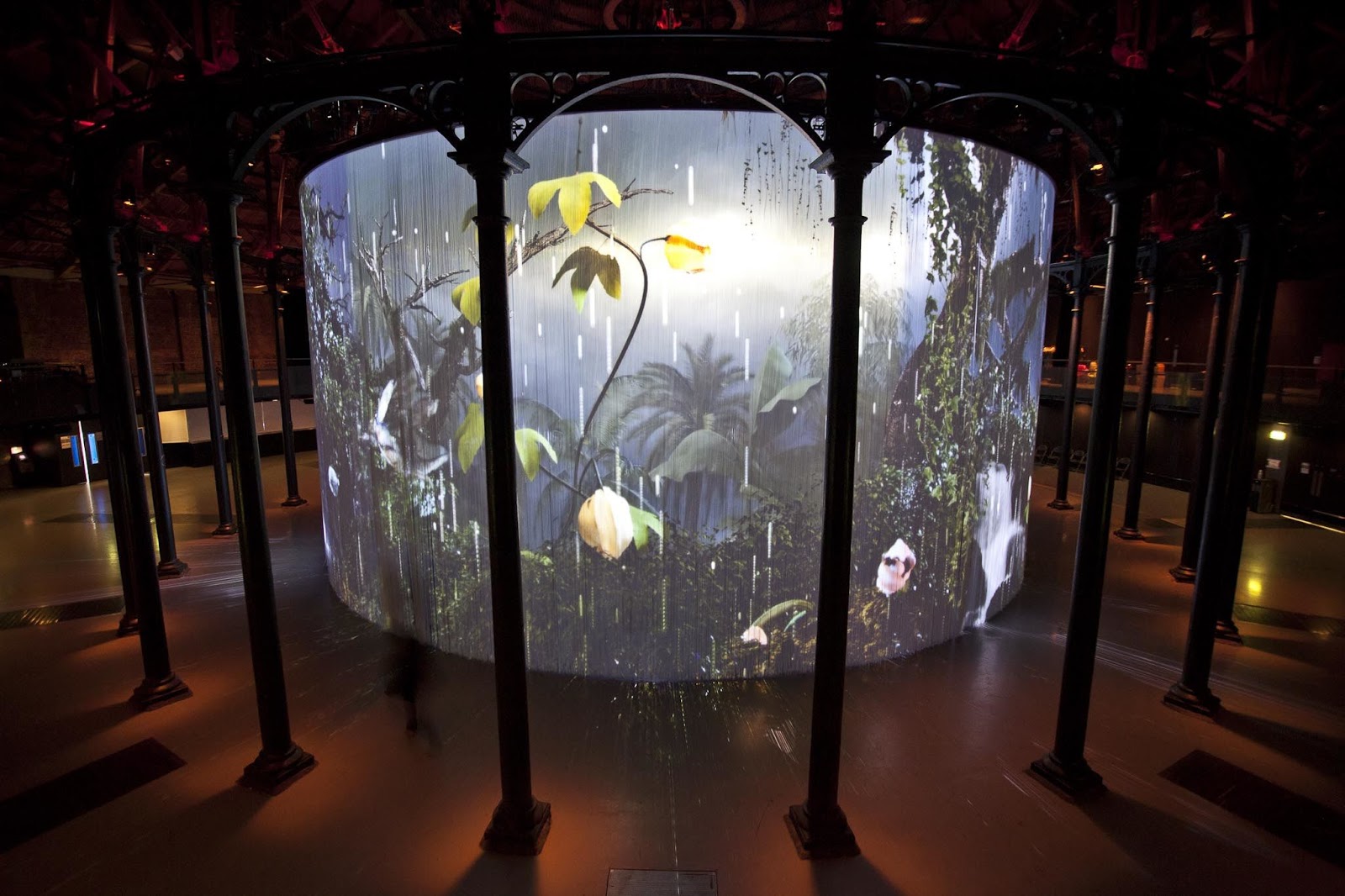 The installation, known as ‘Curtain Call’, is a 360-degree immersive experience consisting of 5,600 silicon rods suspended from an 18 metre diameter ring, thus creating the ‘curtain’. The set-up of Curtain Call is no small feat. The rods themselves clock in at an impressive 7 tonnes and are suspended from a complex rig topped by multiple projectors; the accurate placement of which is responsible for the seamless 360 display experience.