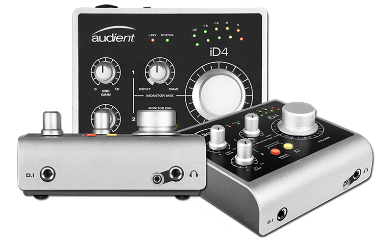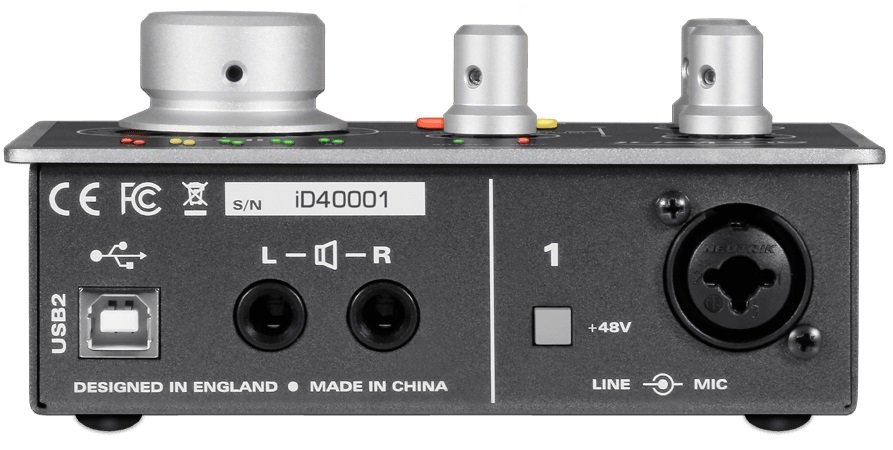 The iD4 has everything you need in a small interface to work with. It has the USB2 port, 48v phantom power, 2 balanced speaker outputs, a mic/line combo in, and DI and headphone ports on the front.