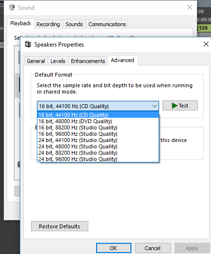As with all interfaces, it has different sample rate options and latency settings. As you can see in the sound properties below, you have all the bit depths and sample rates you’ll probably need with this modest setup. The same applies for the recording properties obviously.