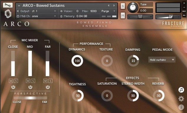 Once again, Fracture Sounds have done a fantastic job at collating a crisp clean range of samples that are wonderfully transparent in the way they present the sound. The edits and final polish of each sample are smooth and consistent, The library offers several customisations, including a ‘Dynamic’ control, and a ‘Texture’ control to blend between performance styles that can be allocated to your mod wheel. This is a nice touch and allows smooth transitions between styles to achieve a realistic sounding performance. ARCO also comes with a number of effects, such as saturation, stereo width, and reverb, all with clear values of 0 to 100 (with 100 being the full effect).
