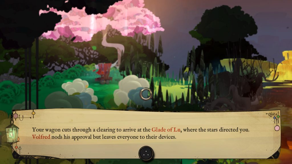 The sound design in Pyre is mainly realistic in style and is used to set the surroundings and complement the music, rather than blow your socks off. Things like the creaking of the wagon, straining ropes, the spinning of the wagon wheels as they turn all help to make the animations between map areas more interesting, and make the wagon almost like a cute character of its own, especially when it does a little hop off of the edge of the map and in to the next area with a little whoosh sound.