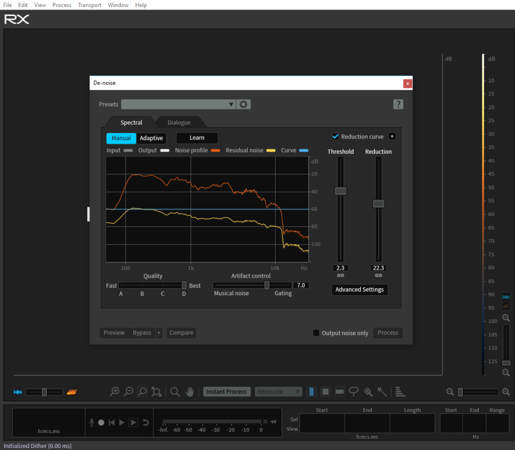 Quick note on this: One of the things I love most about RX5 is the simple way you can compare files. As you can see above there is the “Compare Settings” box. You can check real-time while playing the file and simply quickly between for seamless comparison of the files before and after processing(This is for all processes). It’s non-destructive even once you process as well, and it keeps a record of all your changes. You can see in the bottom right where it says “Initial State”. This is where the log is and you can jump to any stage of the chain at any time, which is brilliant. You can also save chains and make