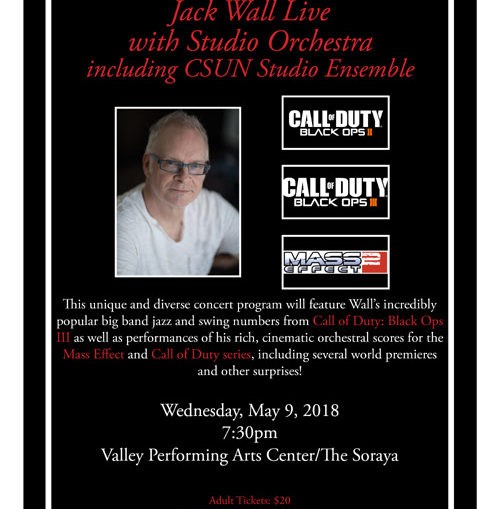 Jack Wall Live With Studio Orchestra - Last Chance to Buy Tickets Jack Wall's award-winning music from the blockbuster video games Mass Effect, Mass Effect 2, Call of Duty: Black Ops II and Call of Duty: Black Ops III will be performed by the CSUN Media Composition and Studio Ensemble full orchestra at Soraya Great Hall, Valley Performing Arts