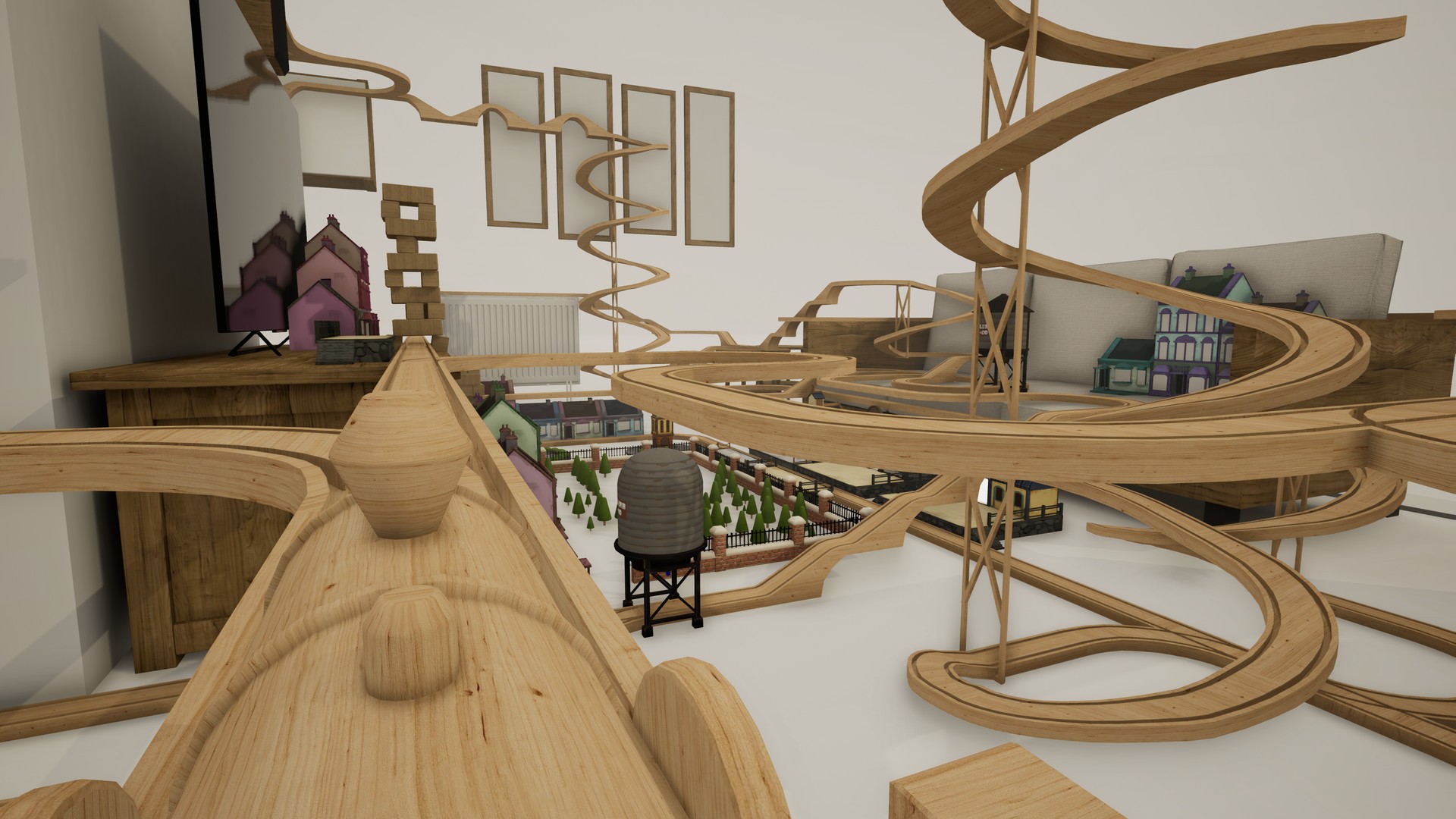 The thing you will really appreciate about this game though, is the ability to place bells on the track and assign a musical note to them. By doing this, you can build up a whole piece of music if you wanted, and play it at different speeds. It’s a really simple touch that has so many possibilities but also just feels satisfying to add musical notes at various points on your track to alert the little wooden townspeople to your presence.