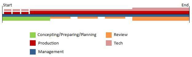 First, responsibilities. What are you actually meant to do? Where do you start? How do your tasks change over time throughout the development of the project? Some tasks will certainly be continuous throughout, some spontaneous. There are no really step-by-step instructions that will lead you to a successfully finished product, but I find that the overall workload can be divided in a few distinctive areas over time. Kind of like this: