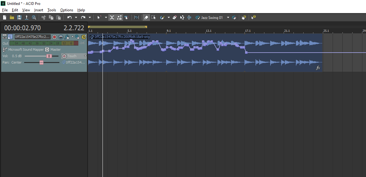 ACID has some nifty features. For example, when you import a track and select the draw tool, you can simply click and drag your cursor across the track and it will duplicate your audio for as long as you want to duplicate it for. This makes working with shorter loops (and longer, too) an absolute breeze as you can import a shorter loop and simply use the draw tool to extend it in milliseconds. You can also click and drag the start and end of the original imported file and it will do the same thing. ACID will also remember what you had on a track after you deleted it so if you deleted a drum loop and decided you wanted it back, you can use the draw tool to simply draw it back in again. This is dependent on the clip’s ‘ACID type’. By right-clicking the track and selecting ‘Clip Properties’, you can change your audio to either a ‘one-shot’ in which the audio will maintain its imported state, ‘loop’ so that it can be extended as explained above, or ‘beat mapped’ so that it can be time-stretched. There is also cluster editing, which enables you to pitch, move, cut, or copy entire sections of your project which is ideal when working with a large session or multiple loops or audio files.
